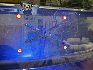 - 将车牌框架螺钉垫圈(4 个)安装到掀背尾门上。