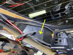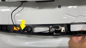 注请勿将饰板完全固定。保持饰板在掀背车门上不动,然后将后视摄像头布线到饰板支架上。