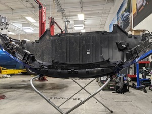 在助手的帮助下,将前饰板总成从左右翼子板支架上松开,然后将总成从车辆上拆下。