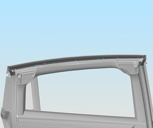 注5 个补件螺钉,T25,3.5 Nm,安装新的补件螺栓,小心提起安全气囊,以便能够到下部螺钉,将固定玻璃总成上边缘安装到侧梁密封条内,调整固定玻璃位置,使其与防松螺母对齐,将固定玻璃密封条插入并紧固到车门总成上