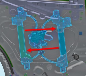 先将升降器安装到后车门内,然后将升降器 2 个梁收拢,注意确保升降器上的螺柱穿过了车门门板