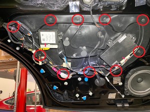 拆下用于将升降器固定到左后车门上的上下螺母