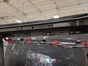 - 将左后车门中间饰板间隙隔套放到线束位置,然后固定将间隙隔套连接至线束的卡子(4 个)。