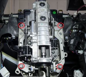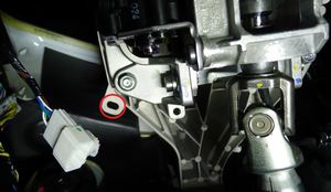 将下部转向柱轴滑到转向齿条上,然后用螺栓固定。