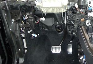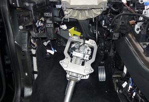 注将下转向轴从隔板中引出,同时将上转向支架从驾驶位车门取出。