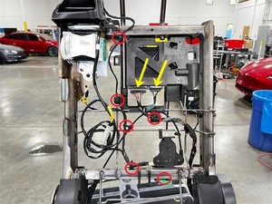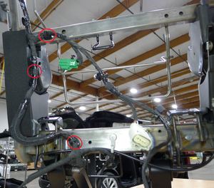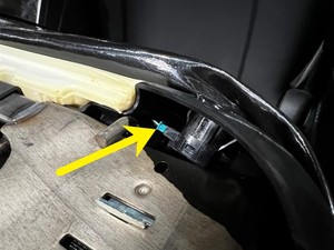- 固定将第二排右侧座椅线束连接到座椅框架上的卡子(6 个),然后连接控制器电子控制单元 (ECU) 电气连接器(2 个)。