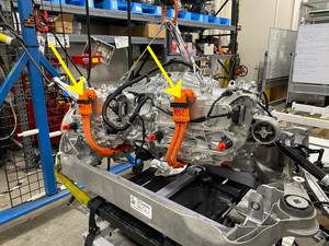 在协助下,使用起重机架降下后驱动单元吊索工具,将半轴从后驱动单元上移开,并将后驱动单元置于后副车架上方。
