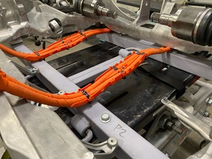 将后驱动单元左右高压线束安装到后驱动单元上,然后安装将后驱动单元高压线束固定到后驱动单元上的螺栓(2 个)。