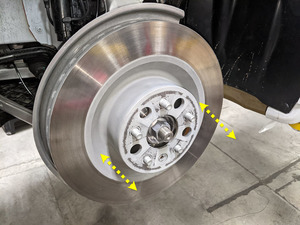 - 使用制动器清洁剂清洁左前制动盘表面,然后使用无绒布将表面擦拭干净。