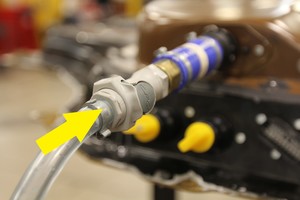 - 将压力测试固定装置软管从冷却液泄漏测试适配器上断开。