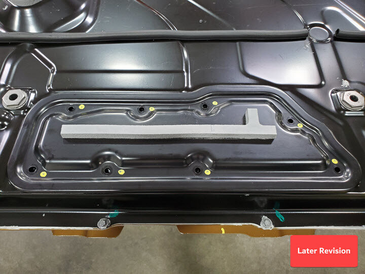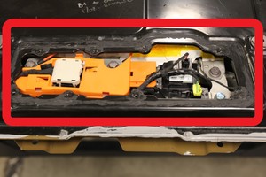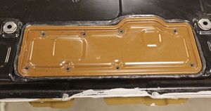 - 2022 年 9 月 19 日之前生产的车辆 - 使用不导电的塑料凿子或其他非破坏性工具,清除高压电池和高压电池后检修板上的密封胶。