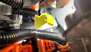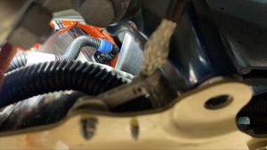将高压电池至前驱动单元变流器软管放在车辆上,然后安装将软管固定到变流器的软管卡子。