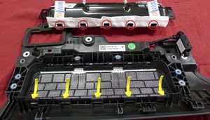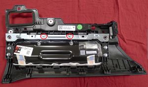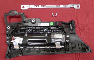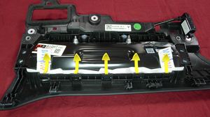 将副驾位膝部气囊放入副驾位膝部气囊盖板中,固定锁片(5 个),然后安装新的螺栓(4 个),将盖板连接到气囊上。