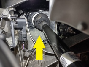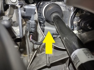 注1 个 U 型螺栓,2 个螺母,10 毫米;手动拧紧;将电缆缠绕在内侧接头处,然后用 U 型螺栓紧固;使用带电缆孔眼的滑动锤释放接头;为避免损坏半轴护套和油封,拆卸时请小心操作;如配备有机油冷却器(高性能版),在拆卸和安装时将毛巾放在机油冷却器上以提供保护。