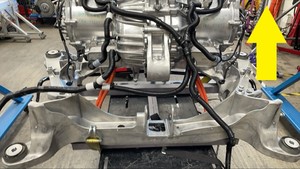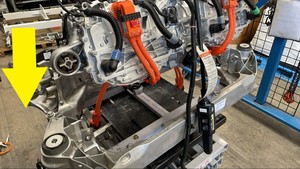 使用起重机架,升起驱动单元吊索工具,小心地将后驱动单元从后副框架中提升出来,根据需要布置后副框架电气线束和冷却液软管。