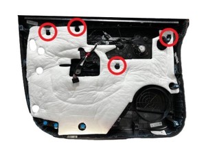 - 将右前车门饰板噪音、振动和粗糙度 (NVH) 垫安装到右前车门饰板上,然后紧固用于将噪音、振动和粗糙度 (NVH) 垫固定到饰板上的钩子(4 个)