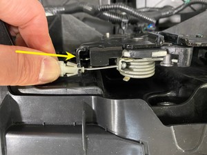 - 下压锁片(2 个),将前备箱盖闩锁传动装置和电缆从前备箱盖闩锁总成上松开。