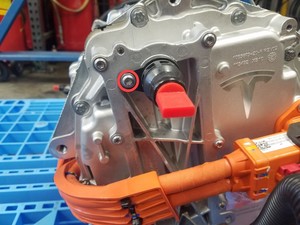 拆下并弃用将后驱动单元直型液力联轴节固定到逆变器的螺栓,然后径直拉出联轴节以将其从总成上拆下。