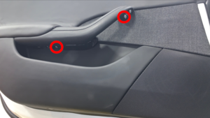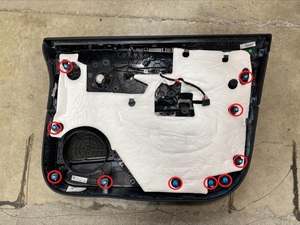 - 将左前车门饰板放到左前车门上,固定分离拉索,连接电气连接器并锁紧连接器锁,然后固定用于将饰板固定在车门上的卡子(10 个)。