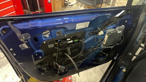 撕掉左前车门内侧密封条胶衬,将密封条安装到左前车门上,然后紧固用于将密封条固定到车门上的卡子(8 个)和锁片。