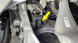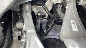 将左侧行驶高度传感器放在副框架上,然后安装将传感器固定到车辆的螺栓。