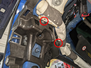 - 松开将左侧帘式气囊固定到左侧 B 柱上部门框硬盖板支架上的卡子(2 个),然后将气囊从支架上松开。