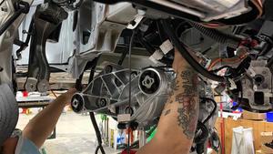 - 在协助下,降下运送千斤顶固定装置,并在前驱动单元降下时围绕前驱动单元挪动线束和软管。