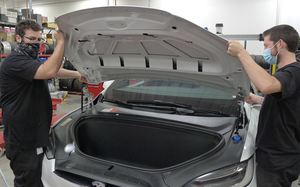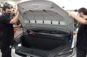 在助手的帮助下,安装前备箱盖。