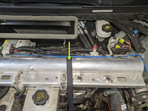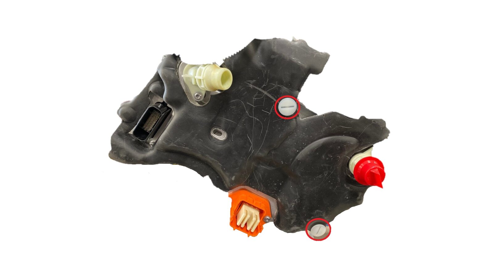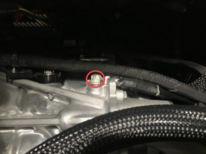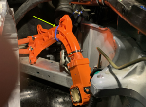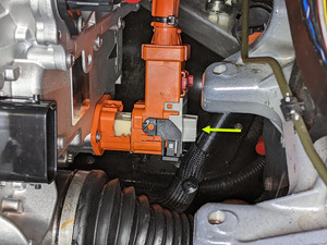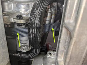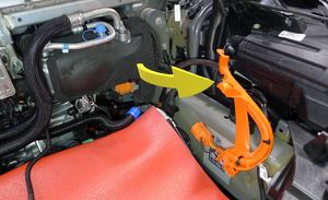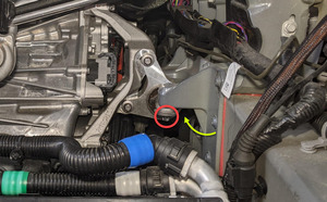 - 将高压加热泵支架从空调压缩机排放管路下方移出,然后移至左侧。