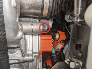 31 Nm (22.9 lbs-ft) - 朝着空调压缩机的方向滑动,将动力总成冷却液泵安装到空调压缩机下部支架上。