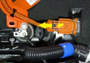 - 滑动黑色锁片,按下释放装置,断开高压线束与空调压缩机高压接头的连接。