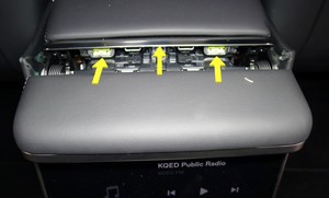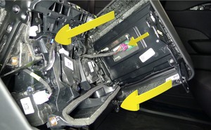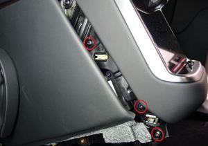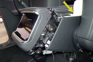 - 从中控台总成上取下车间毛巾,然后固定将左侧中控台侧板后部连接到中控台的卡子(4 个)。对右侧重复此步骤。
