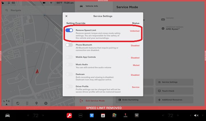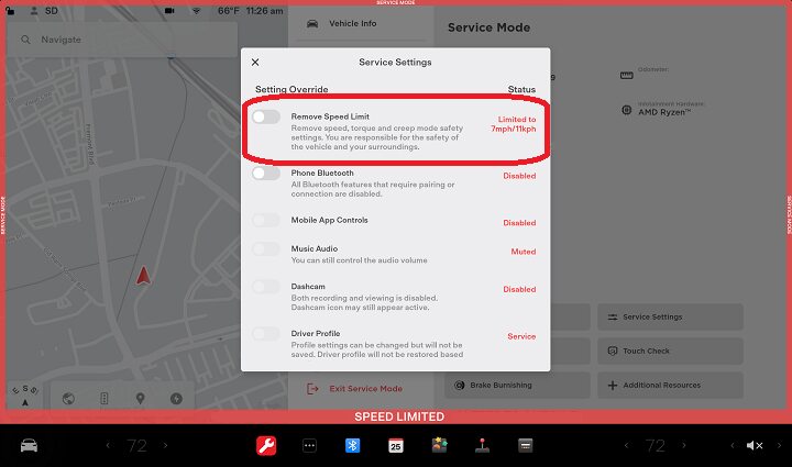- 禁用触摸屏上的“限速”功能。点击Service > Service Settings > Remove Speed Limit。