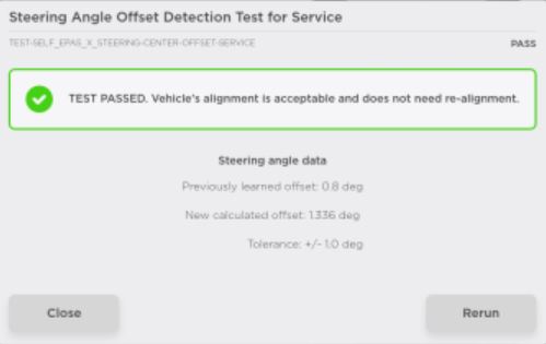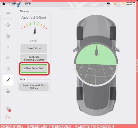 点击Service > Chassis > Alignment and Tires > Offset Drive Test > Run,然后驾驶车辆以至少 18 英里/小时(30 公里/小时)的速度直行 500 米。