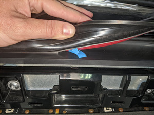 注内侧密封条与车身缝隙对齐,距离边缘 1 cm。注密封条放置到正确位置后,边按压整条密封条边擦胶。