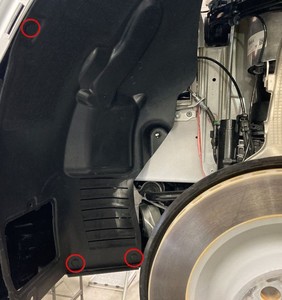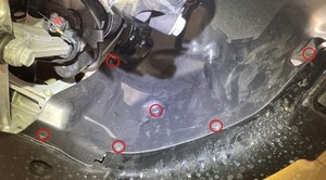 - 松开将左侧前轮拱内衬后部固定到车身的卡子(6 个),然后将轮拱内衬从车辆上拆下。