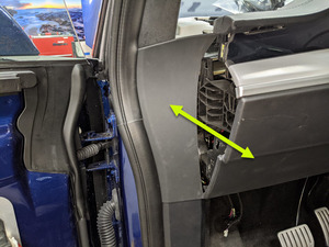 3 个定位销;小心地将总成前端向下移动到仪表板托架上,然后将后端向下放置到位;将定位销与仪表板托架对齐然后向前固定;建议请助手帮忙