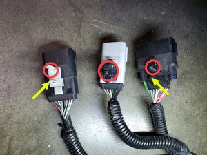 2 个连接器;提起并松开绿色锁片;向外拉动黑色连接器锁以断开连接;松开紧急响应回路上的红色锁片