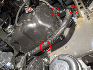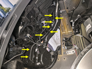 - 松开将前备箱线束固定到风挡玻璃清洗器的卡子(3 个)