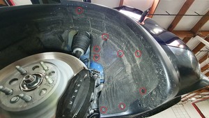 - 紧固将后空气悬架管路固定到右后轮罩的卡子(10 个)。