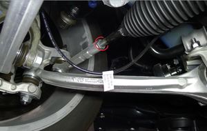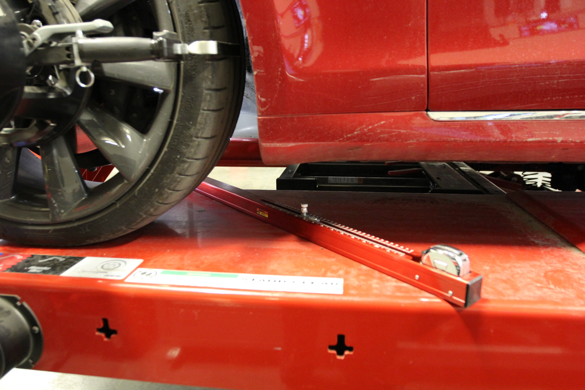 使用底盘高度测量工具(1071271-00-A)在 4 个指定点测量车辆的行驶高度,并确认测量结果与规格的偏差不超过 +/- 5 毫米。