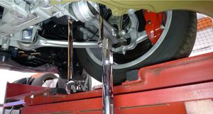 - 在协助下,将车辆对准定位架坡道,驶入定位架,然后挂入驻车挡。