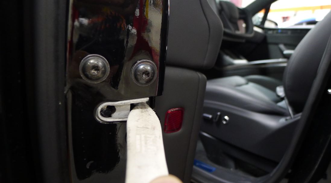 在左前车门打开的情况下,用塑料饰板工具或类似工具手动锁上车门。