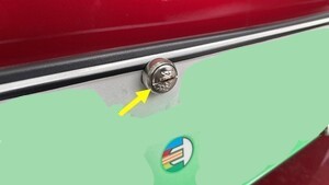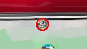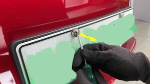 - 在每个螺栓盖上割出一条狭缝,然后使用螺丝刀将螺栓盖(4 个)从车牌支架上拆下。