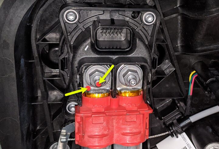注2x HV joints, Measure both joints at the highlighted locations, The acceptable resistance is between 0.050 mΩ (50 μΩ) and 0.270 mΩ (270 μΩ).If the resistance is greater than 0.270 mΩ (270 μΩ), there is too much resistance in the High Voltage joint. Remove the fastener, clean areas with isopropyl alcohol, install fastener back and test again. If the resistance is lower than 0.050 mΩ (50 μΩ), reposition the probes and measure again. If the resistance is repeatedly between 0.00 mΩ and 0.050 mΩ (50 μΩ), Hioki test passed, proceed to next step.
