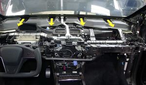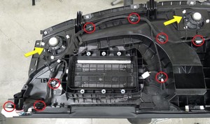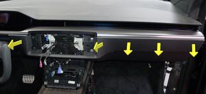 21 个卡子,6 个定位销,4 个连接器;从仪表板底座上松开所有仪表板装饰饰件连接器卡子,然后从仪表板线束上断开连接器