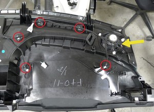 7 个卡子,1 个定位销;确保仪表板底座上的卡子在拆除前完全松开
