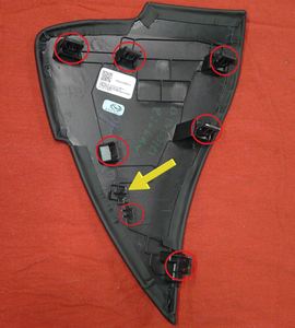 2 个卡子,3 个固定销;将卡子从 A 柱上部和仪表板分总成上松开,将 A 柱中间饰板向上提起,使其脱离 A 柱下部饰板