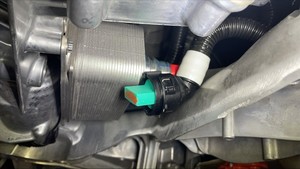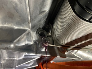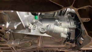 注小心地将塑料楔子插入机油滤清器盖板和后驱动单元 (RDU) 之间,小幅度挪动楔子,直至看到绿色的 O 型环,用手拆下机油滤清器,残留的油液会从外壳中排出,等待油液排尽。注Tesla 建议在拆卸后换上新的滤油器。凡是存在明显腐蚀或泄漏的滤油器都必须更换。