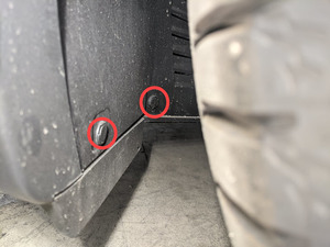 HW4 仅限特定车辆:拆下将左前轮毂内衬固定到裙板的卡子(3 个)和螺栓,然后将内衬从左前翼子板饰板上拉离。